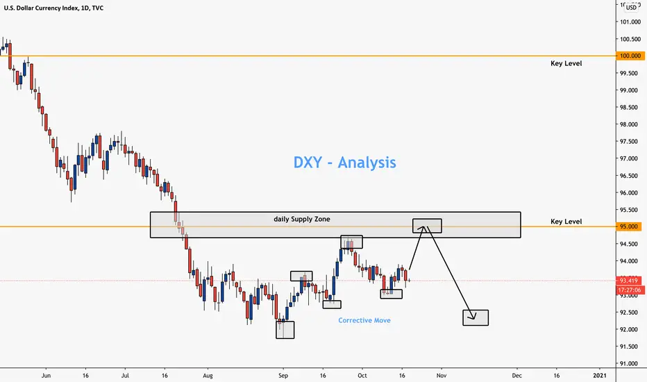 Also on the chart we can see only bearish signal. We are dropping very strongly from an important Key Level (100). We broke through the 95. But now it is time for a Correction to the upside. As we can see the market is providing us a corrective up trend structure. Also we go upfront a daily Supply Zone and the Key Level. I do expect at test of the level. Also this move would fill the orders from the daily Supply Zone. This will lead afterwards to a strong drop to the downside and the market will continue to follow the overall down trend.