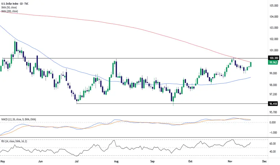 The U.S. Dollar Index (DXY) continues to hover near the psychological 100.00 level after recovering from its October lows. Price is currently consolidating just below the 200-day simple moving average (SMA), which aligns closely with horizontal resistance around 100.30 — a level that has capped rallies several times this year.