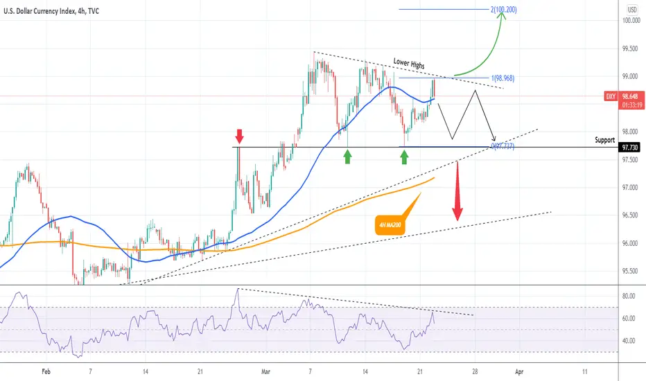 The U.S. Dollar Index just got rejected on the current 4H candle on the Lower Highs trend-line that started on the March 07 High. As long as this holds, the price should drop towards the 97.730 Support, which has already held twice, thus creating a Triangle pattern.