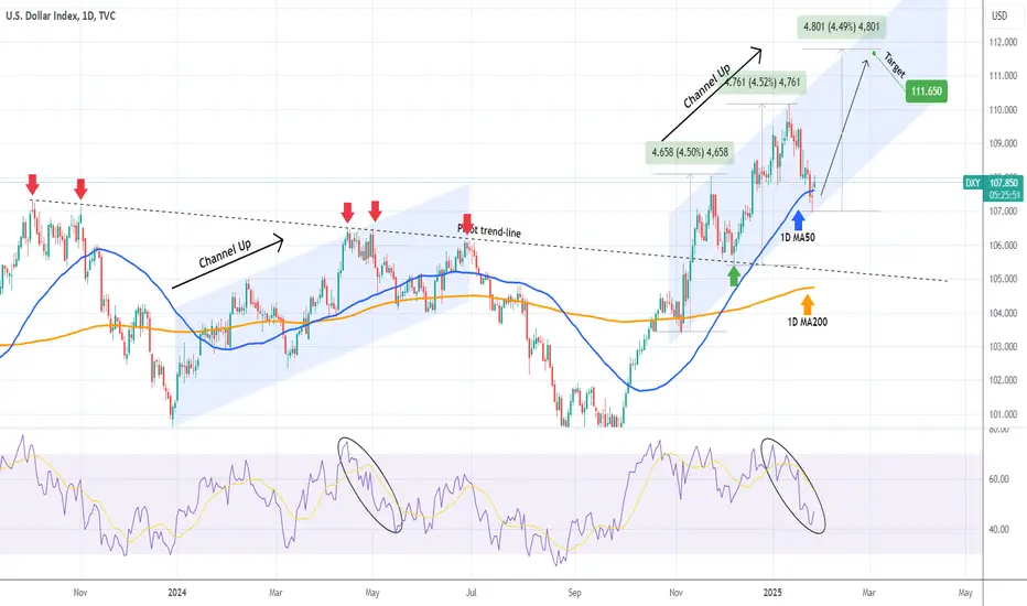 The U.S. Dollar Index (DXY) has been trading within a Channel Up since the November 05 2024 Low and the break-out above the 1D MA200 (orange trend-line). Yesterday it made a new Higher Low exactly at the bottom of the Channel and shortly after breaching the 1D MA50 (blue trend-line).