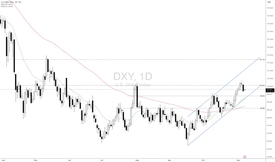 - DXY retested the psychological level at around 100 and rejected. The price is above both EMAs, indicating upward momentum is still intact.