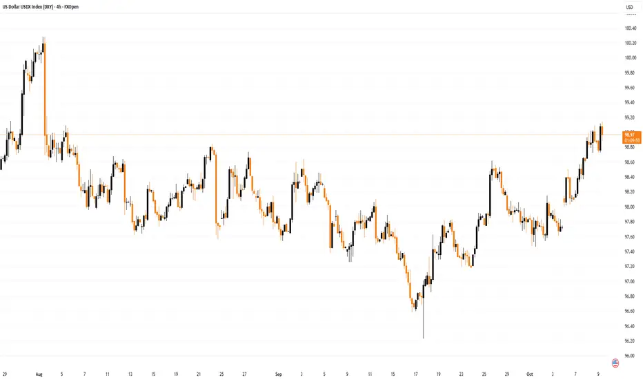 The chart shows the Dollar Index (DXY) trading above the 99-point level today — its highest since early August. The dollar’s strength is supported by the weakening of other currencies:
