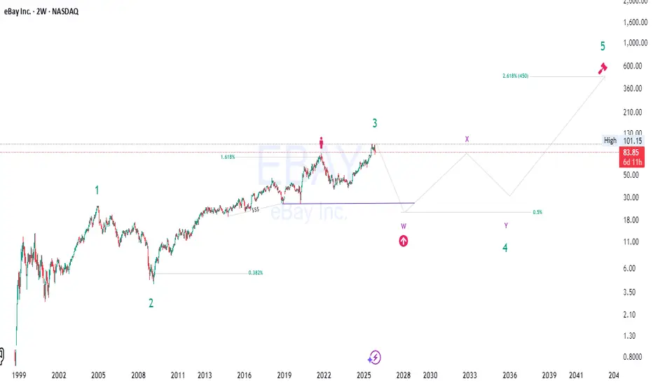 eBay may be completing a major Wave 3 and entering a large corrective structure (W–X–Y) before a massive long-term Wave 5 rally toward the 2.618 extension (~$450). This aligns surprisingly well with fundamentals and market behavior.