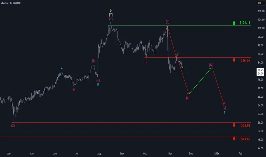 eBay has recently made another move higher, briefly reclaiming the $86.36 level. However, the stock has since resumed its downward trajectory as anticipated and is expected to continue selling off soon as part of magenta wave [iii]. Overall, this magenta downward impulse should push price closer to support at $55.96, completing turquoise wave 1.