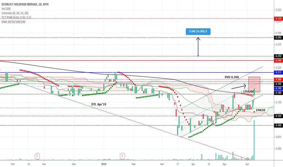 ECOHOLDS kelihatan memerlukan momentum yang kuat bagi mencapai semula PHV di paras 0.200 sekaligus BO pada trendline di paras harga 0.190 sebelum memecahkan Resistance kuat di 0.200 sebelum menjadi support kuat