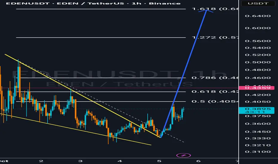 After a long downtrend and consolidation phase, EDEN is finally showing signs of reversal with a breakout from the falling wedge pattern on the 1H chart.