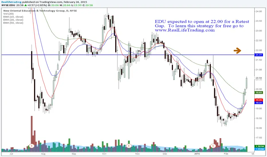 EDU expected to open at 22.00 for a Retest Gap. To learn this strategy for free go to RealLifeTrading.com