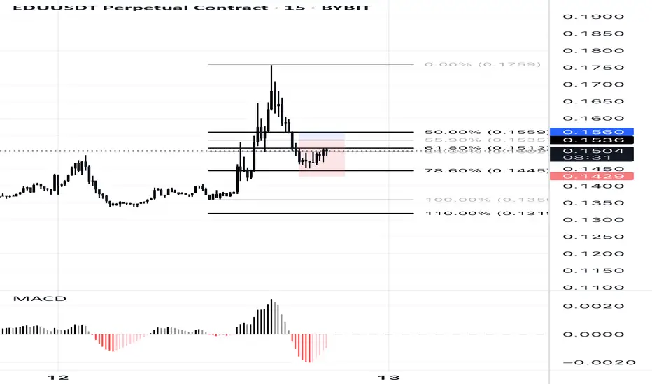 EDUUSDT printed a strong pump to 0.1759, followed by a sharp sell-off. Price is now rejecting the 61.8%–64% Fibonacci zone (0.1512–0.1522) after failing to reclaim the 50% Fib (0.1559) level.