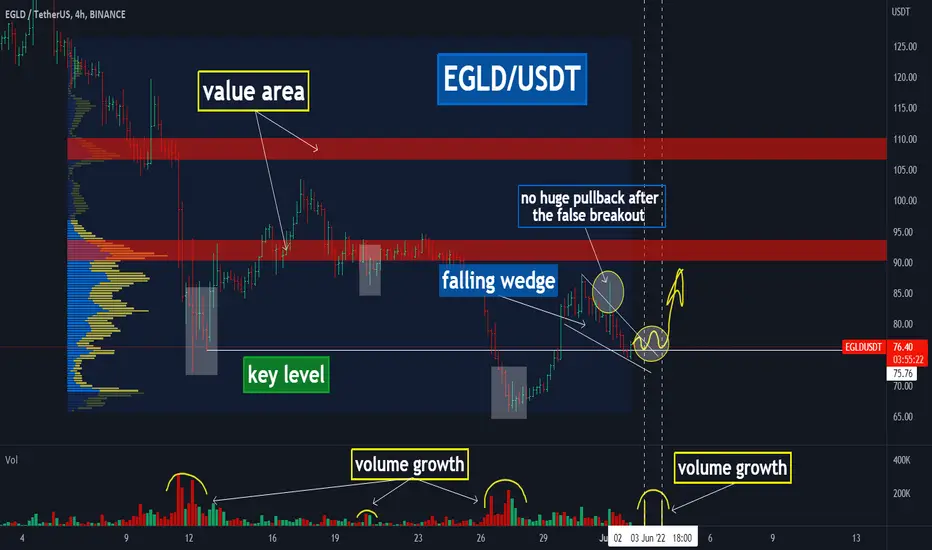 EGLD price made a bullish wedge after a false breakout. As we know, the crypto market has its own specifics of patterns. Often it happens with manipulations, collecting of stop losses, false breakdowns, etc.