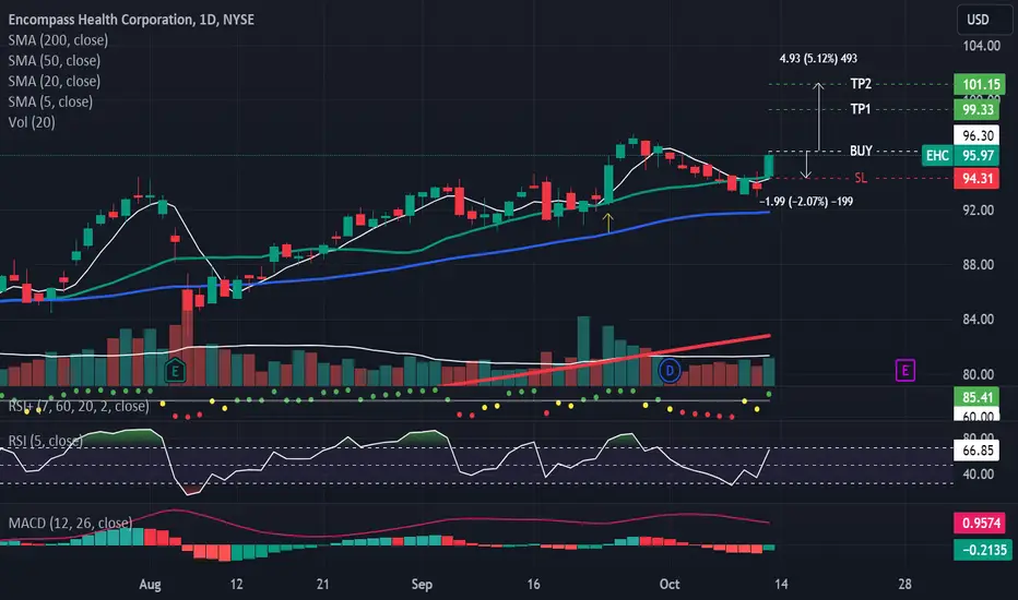 EHC: I have a green setup signal(dot Indictor). It has an excellent risk-to-reward ratio(RR:). I'm looking to enter long near the close of the day if the stock can manage to CLOSE above the last candle highs(white line). If triggered, I will then place a stop-loss below(SL) and a price target above it(TP1-50%,move SL to breakeven)(TP2-50%).
