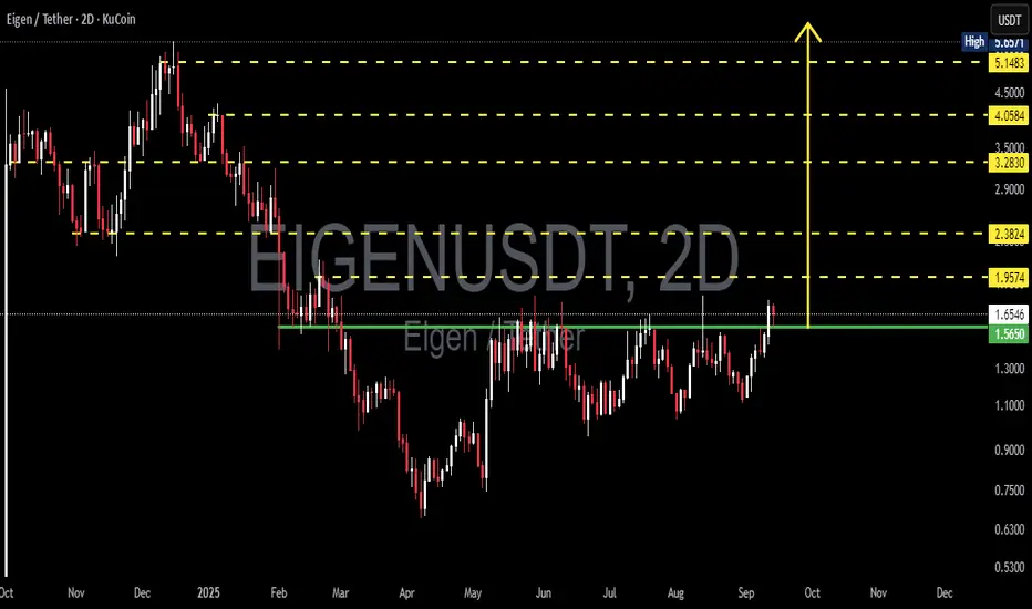 EIGEN/USDT is currently at a very decisive moment. After a long downtrend from late 2024 into early 2025, the price formed a solid bottom around 0.60–0.70 in April. Since then, the market has been showing signs of accumulation, building a sequence of consistent higher lows.