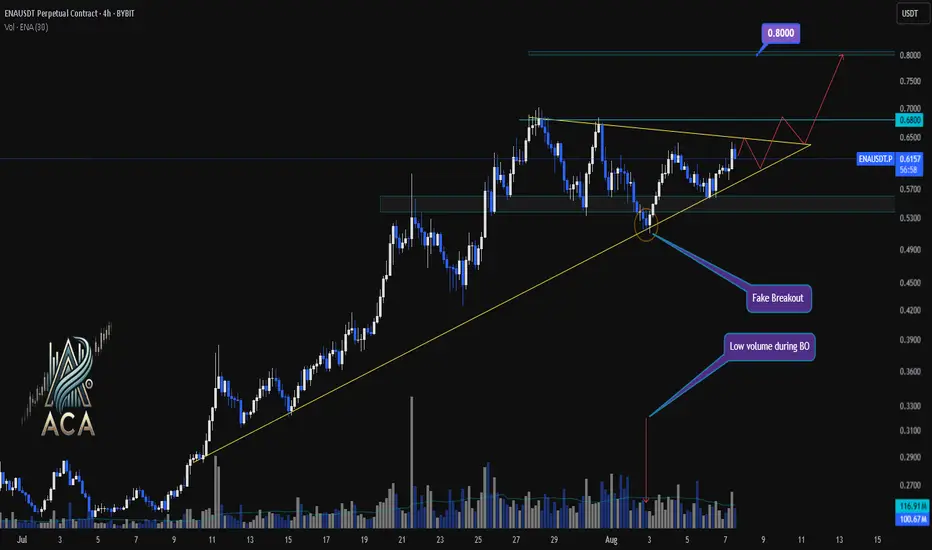The 4-hour chart shows ENAUSDT consolidating above a critical ascending trendline, with price action tightening into a symmetrical triangle formation. Multiple attempts to break down have resulted in a fake breakout, as indicated by low volume during the breakdown — a classic sign of seller exhaustion.