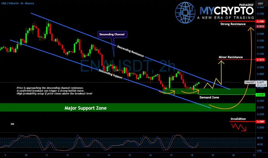 💎Price action has been respecting a clean descending channel, with repeated rejections at the upper resistance and strong bounces off the lower boundary. #ENA has now bounced from a well-defined demand zone between $0.2300 and $0.2492 for the third time. This double bottom structure is a powerful reversal signal, especially if a confirmed breakout follows it.