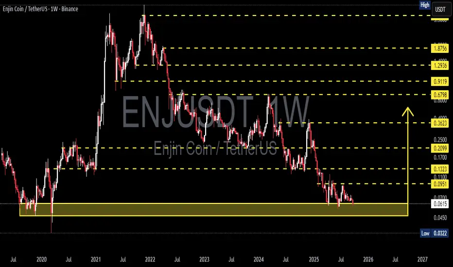 Enjin Coin (ENJ) is now sitting at one of the most crucial levels in its history. Price is consolidating within the 0.045 – 0.070 USDT demand zone, the very same area that once served as the launchpad for the massive 2020–2021 rally.