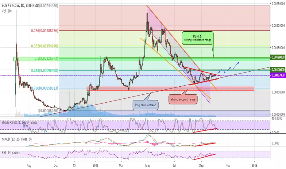 I also made the necessary corrective pullback, and in the last period I found good support in the form of a long-term uptrend. At the moment, forms a triangle, the breakdown of the upper face of which will indicate the continuation of the construction of growth. The main target areas are the levels 0.00100000 and 0.00128000. If the triangular pattern is punched on the bottom, then there will be greater chances to touch the support range of Fib 0.786 (around 0.00058800) again.