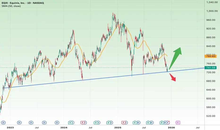 EQIX has reached a long-term ascending support line that has held since early 2023. The price is currently reacting upward from this zone, making it a critical decision point.
