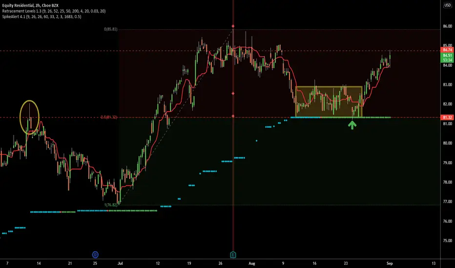 This is what I like to see: the stock EQR pulled back to a 50% Retracement Level following an earnings high. This level matched with a past high price action and price hesitated for many weeks at the level before launching off it. The entry point was actually on a morning volatility spike 8/19/21 but this does not show properly on Tradingview data. Study this example.
