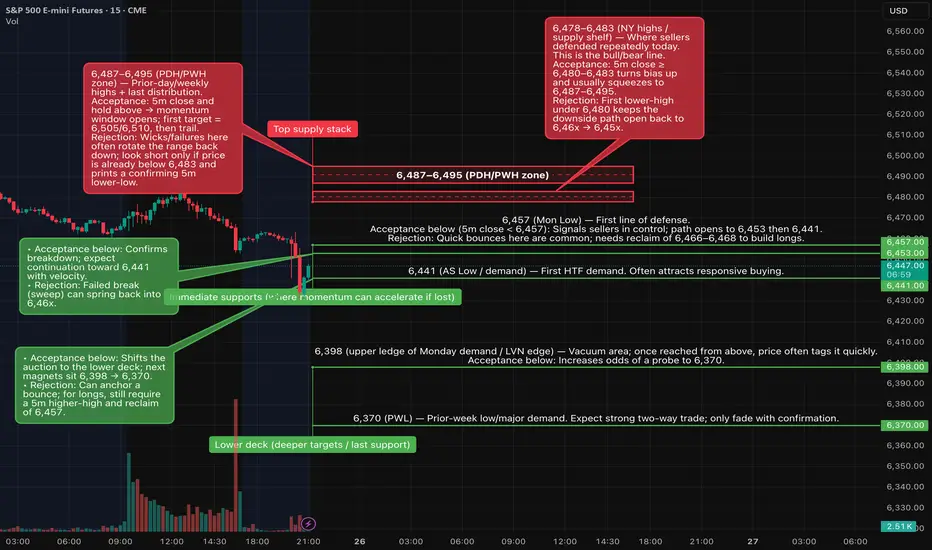 Price closed beneath the mid-range pivot (6,466–6,468) after repeated rejections from the 6,478–6,483 supply shelf. Immediate downside magnets are 6,457 → 6,453 → 6,441; deeper LVN/demand sits 6,398 → 6,370. Overhead, a squeeze can develop if we accept back above 6,48x toward 6,495 and the 6,50x handle.