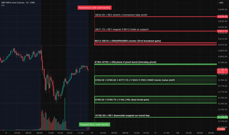 NY PM (13:30–16:00): If morning sets a trend, expect continuation toward RE1/RE2; otherwise back-to-value rotations inside 6780–6795.