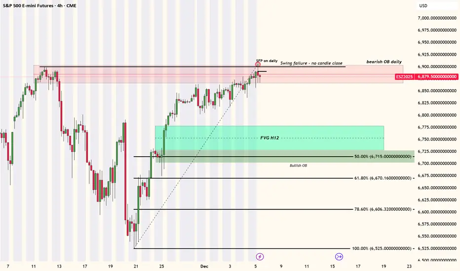 Price was in a uptrend to an area where a bearish order block sits on the daily and weekly time frames. Additionally, there was a swing failure point from the previous range high to the current (area marked in red). Price may revisit the 12HR FVG with a bullish OB that sits right below it. Possible scenario - Price fills the FVG and may enter the bullish OB. The bullish OB also sits on the .50 fib from the range daily swing low to the current swing high.