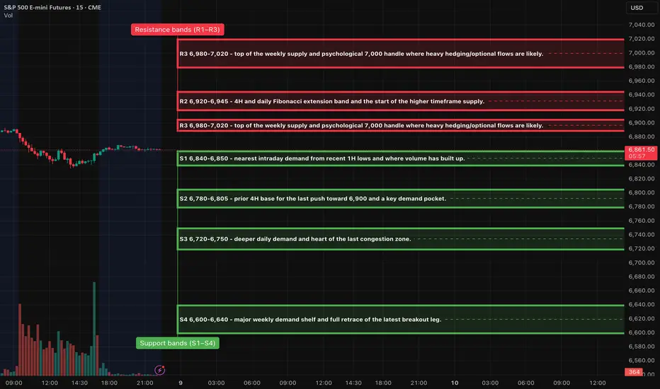 Examining the shorter-term 1-hour and 30-minute charts reveals that Monday experienced a lower high compared to last week's peak, leading to a decline towards the 6,820s before regaining ground in the 6,860s. Currently, the ES is positioned midway within the support band and beneath the intraday highs around 6,875-6,895, indicating a balanced short-term outlook: buyers are engaged below the 6,850 level, while selling pressure emerges near 6,890.