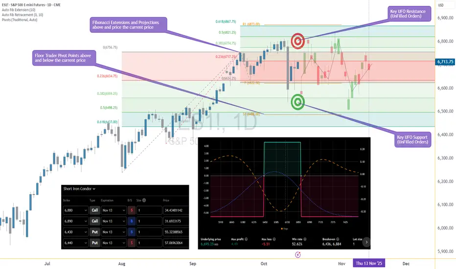 The chart of the E-mini S&P 500 Futures (ES) reveals a tight compression zone forming between Fibonacci extensions and retracement levels above @ 0.618 (≈6,868) and below @ 0.618 (≈6,437). This overlap with Floor Trader Pivots — specifically R1 at 6,873 and S1 at 6,488 — paints a classic range structure. This setup can be the natural habitat for an Iron Condor.