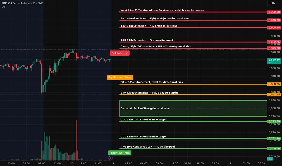 Today’s price activity has formed a tight range, approximately between 6857 and 6865, with the previous day’s high located near 6873 and early lows today around 6820. The market appears to be consolidating near last week’s highs, with clear liquidity zones identified both above 6873 and below 6840.