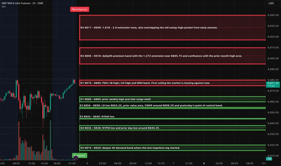 On the 4-hour and 1-hour charts, the E-mini S&P 500 (ES) has been consolidating in a narrow range, roughly between 6835 and 6880, as it builds energy just below the prior high. This range coincides with the 1.272 to 1.618 Fibonacci extension zone, located around 6895 to 6917. Given this setup, the outlook for tomorrow appears slightly bullish, provided the price remains above the mid-range support levels.