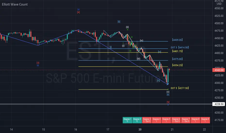 Ok Now let move to today Elliott wave analysis. As we expected this morning premarket was in wave 3 of wave 5 and my felling of ext 5 built was true. And now what we have here, algorithm count quite good we have a 3 of 5 and market close with wave 4, what it's mean? It mean we may have 5 of 5 before bull trap wave b, so if it true where is key area for 5 of 5, you can use old target 4277 or 4228 for 5 of 5 it can fall further, or when we entered 5 we will have new target indicator draw you can use it, I will post target if we have 5 of 5 later.