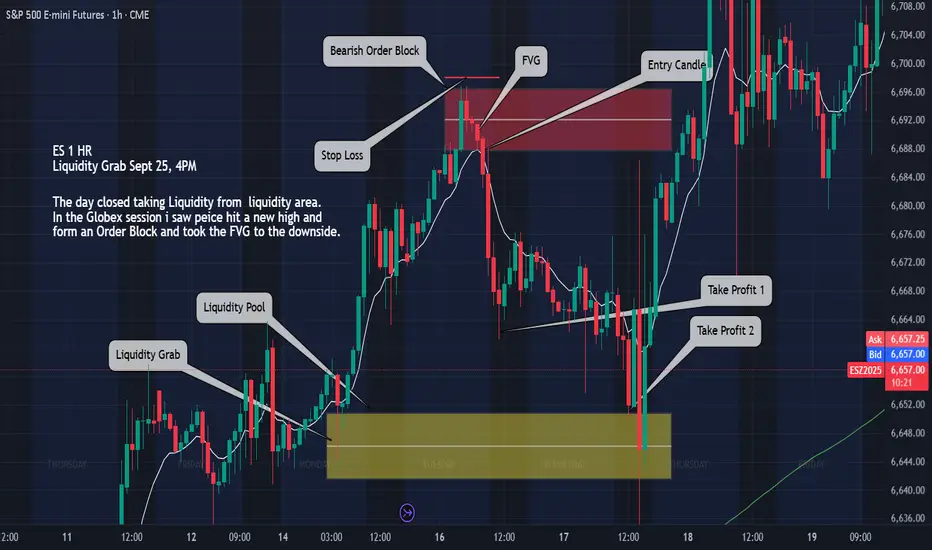 Here is my ES chart showing the liquidity grab to the Fair Price Redelivery on a 1 hour timeframe chart.