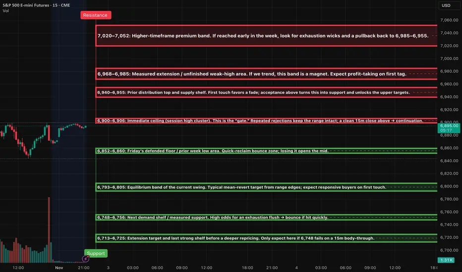 The price is currently positioned just below a key near-term resistance level at 6,900–6,906, following a sharp reversal on Friday from around 6,845. The daily and 4-hour structures indicate an incomplete "weak-high" area above, but the 1-hour momentum has just shifted upward from oversold conditions. As we move into the Asia/London sessions, I anticipate a balance formation within the upper half of the previous session unless we see a decisive 15-minute close above 6,906.