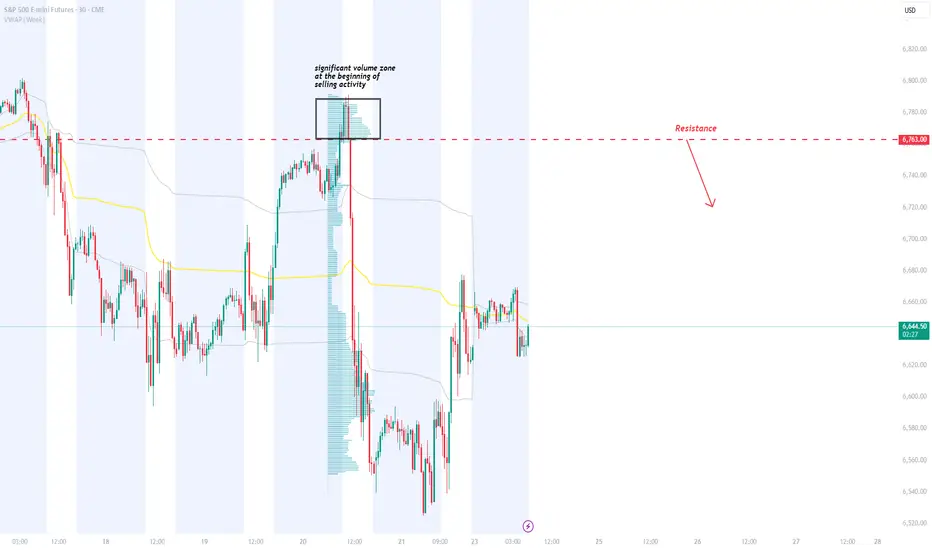 Price is approaching a strong resistance on ES at 6763. This level sits at the start of a heavy-volume zone created during a major selloff, where sellers built short positions and are likely to defend again. A bearish Fair Value Gap aligns with the same level, adding strong confluence. If price pulls back into 6763, the short setup becomes highly attractive.