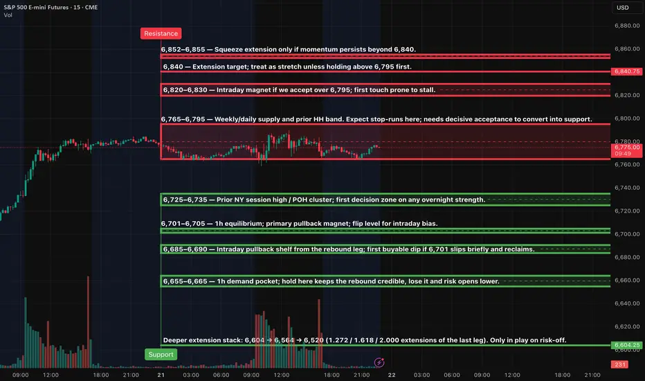 Key zones — support: 6,725–6,735 is the prior NY session high / POH pocket and first decision area on any overnight strength that fades; 6,701–6,705 is the 1h equilibrium and flip line for intraday bias; 6,685–6,690 is the intraday pullback shelf and first buyable dip if 6,701 briefly slips and reclaims; 6,655–6,665 is the 1h demand pocket that keeps the rebound credible; 6,604 is the deeper extension stack that only comes into play on risk-off.