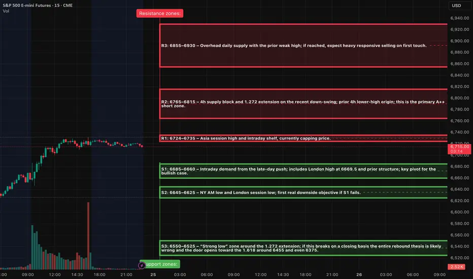 S1: 6685–6660 – Intraday demand from the late-day push; includes London high at 6669.5 and prior structure; key pivot for the bullish case.