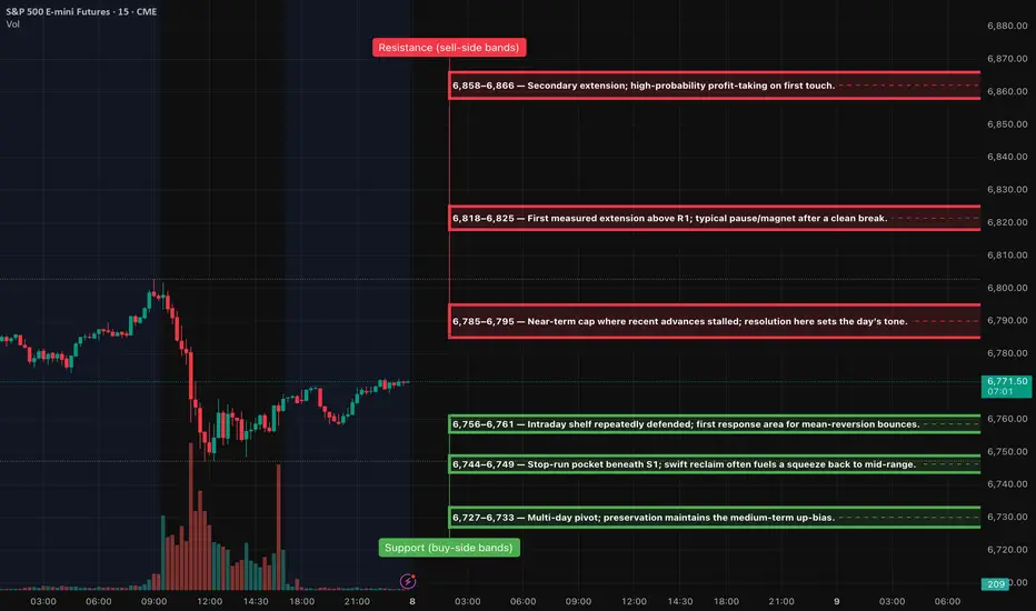 The E-mini S&P 500 (ES) is currently exhibiting a primary uptrend on the higher timeframes while consolidating just below a significant resistance level between 6,785 and 6,795. As we approach the New York morning session, the prevailing expectation is for a range-to-trend expansion, dependent on whether the 6,758–6,795 range is broken. The 6,785–6,795 zone should be regarded as the immediate focal point for decision-making.