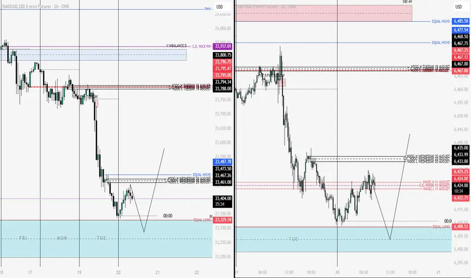 Today we are trading within a discount area, and therefore I will be looking for long opportunities targeting the equilibrium (50% of the range) measured from last week’s highs (ATHs). In addition to that, my main focus is on the imbalances left behind by yesterday’s price action, which remain an important target 🎯. The equal highs I have marked on the chart are also in play — provided that price finds support within the blue zone just below the equal lows.