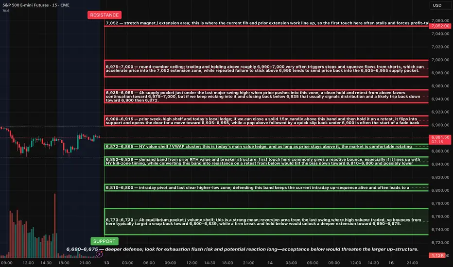 15-Minute to 30-Minute Charts: There’s a well-defined range forming. The highs are established around the 6,900–6,915 level, while the lows are consistently found between the 6,872–6,865 shelf, with further lower shelves below. Today's price action has effectively mapped out a framework for potential trading opportunities moving into tomorrow.