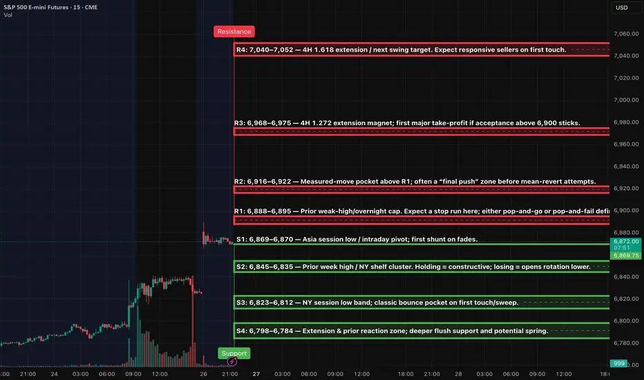 Price is pressing a thin ceiling at 6,875–6,895. With ES at ATHs, the next upside extension targets sit at 6,968 → 7,044 → 7,128 on 4H. HTF trend is up, but intraday is stretched and vulnerable to a sweep-and-revert before any fresh leg.