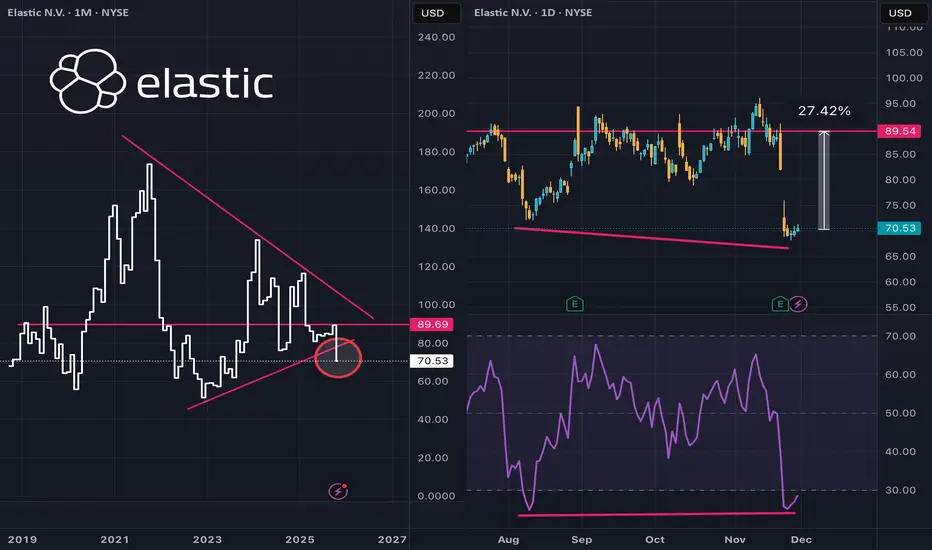 ESTC has slipped below the bottom edge of a large symmetrical triangle.