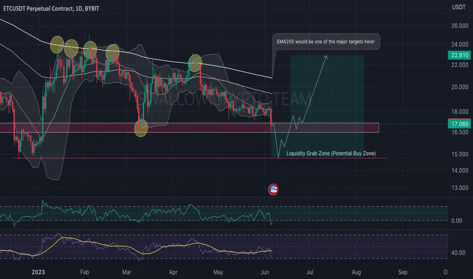 ETC/USDT is next pair on our watchlist which is still looking for a support to settle the price upon. We are looking more at that Liquidity grab zone here which seems to the major zone for price to touch here this week. We need a confirmation of breaking the current support and once we get the breakdown we will most likely head towards $14.700.