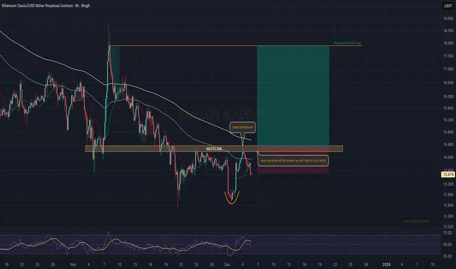 ETC keeps rejecting around the neckline, and until buyers break and secure this level there’s no clean long setup yet. The good part is that we already saw a failed breakdown at the lows, which shows buyers defending the zone.