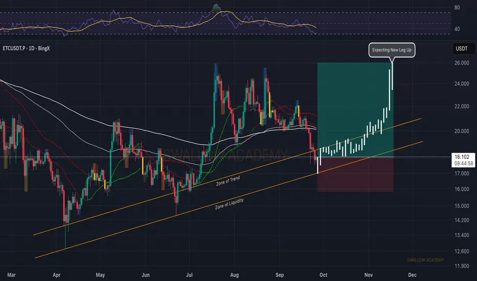ETC keeps grinding higher inside the bullish trend channel. After reclaiming the liquidity zone around $18, buyers have been holding dominance, pushing the price with strong momentum.