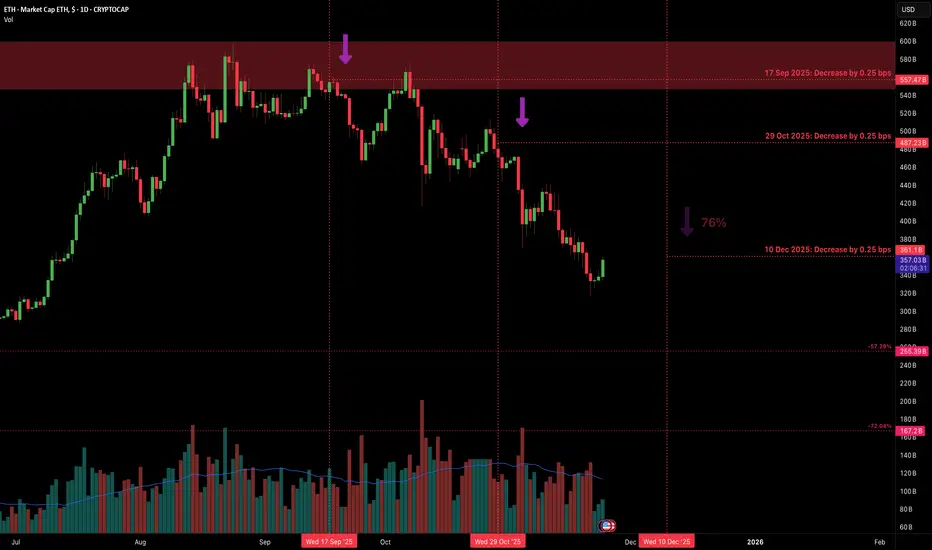 ETHUSDT price being dumped lately. I welcome everyone to analyse the following chart demonstrating almost the cleanest correlation between rate cuts and downtrending effect.