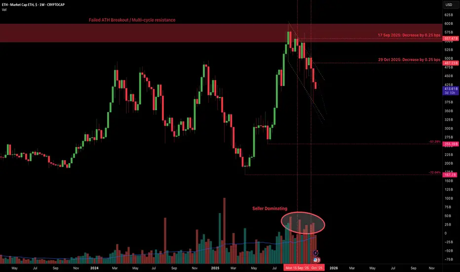 Major factor of influence right now is Fed rate cutting rates + absence of stable release of market data + weakening labor market. For your convenience, dates of the last two rate cuts have been marked to illustrate that ETH is indeed staying below those key market decision dates. The BTC weakness started much earlier, meaning that ETH is under much bigger pressure potentially signalling the end of its bull run phase in Autumn 2025. This is natural tendency to see as ETH always absorbs liquidity from BTC after crypto gold starts to weaken.
