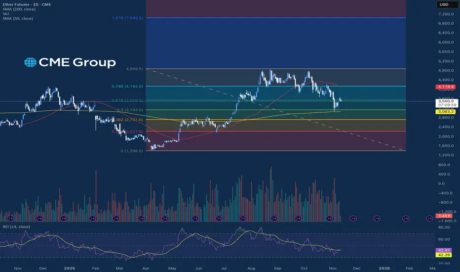 Ether futures selling pressure This sustained institutional presence remains the most critical factor in the market. Ether futures volume saw massive growth in October, showing increasing demand from professional and retail traders for regulated products. As shown in the chart, the 50% retracement level and the 200-day moving average are very close to each other and have acted as a support pocket since the breakout above the 200-day moving average in July.