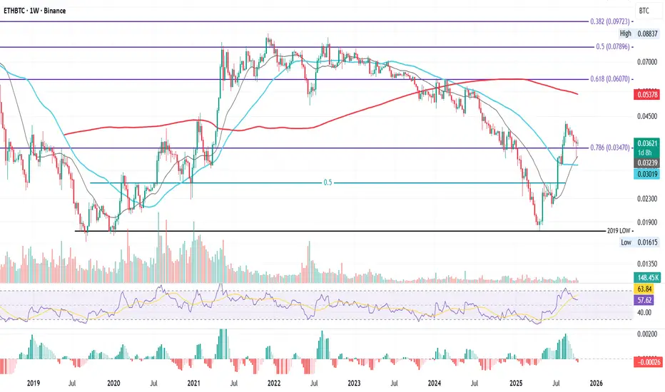 This is ETHBTC on the weekly, now retesting one of the most important Fibonacci levels on the chart: the 0.786 Fib at 0.03470.