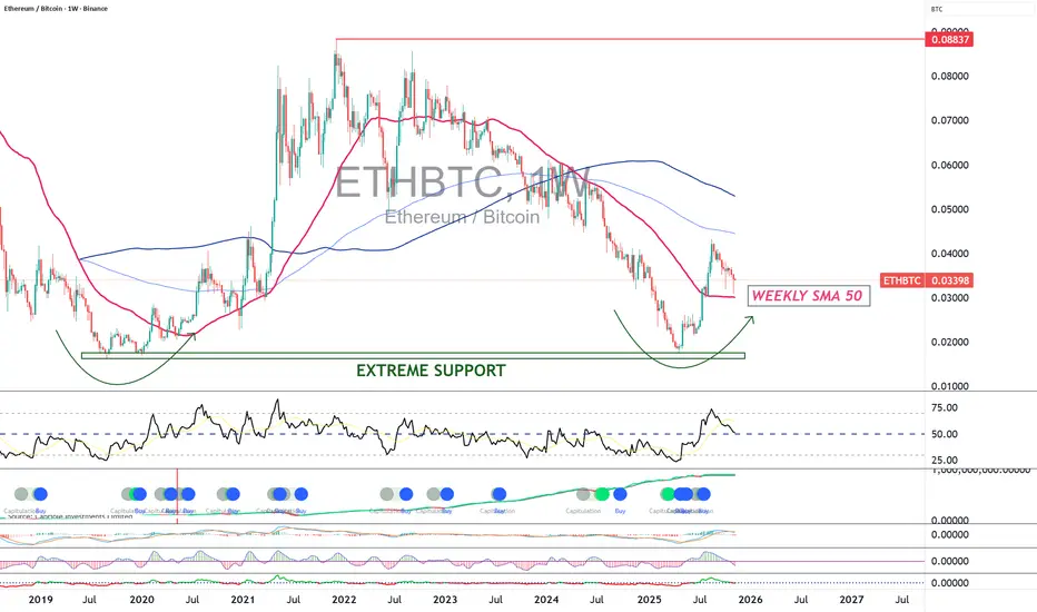 On the weekly chart, the long-term perspective reinforces this scenario. The ratio has formed a broad “cup” pattern, supported by an area identified as “Extreme Support” around 0.020 BTC. After several years of decline, Ethereum has regained relative positive momentum versus Bitcoin. A break above the 50-week moving average, followed by an orderly consolidation phase, could precede a new bullish extension toward the 0.045–0.05 BTC zone, or even higher in the medium term. Historically, every rebound from this support zone has been accompanied by a marked outperformance of ETH versus BTC.