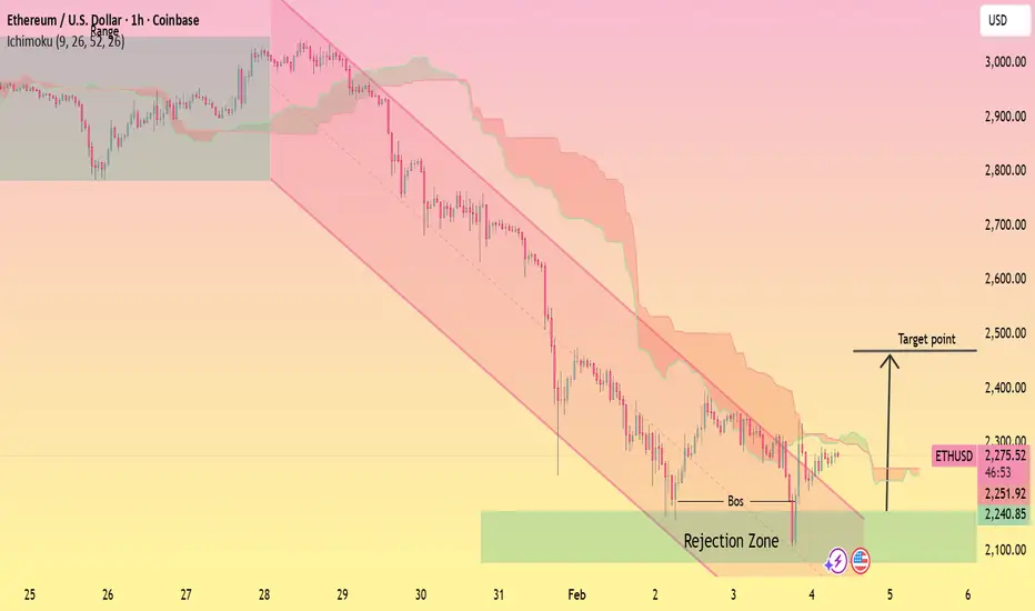 This 1H ETHUSD chart shows Ethereum trading within a well-defined descending channel, confirming a strong bearish trend from late January into early February. Price remains below the Ichimoku cloud, keeping overall bias bearish, but a clear bounce from the highlighted demand/rejection zone has formed a short-term base. The marked BOS (break of structure) hints at early bullish intent after the sell-off. If momentum holds, price could attempt a corrective move toward the 2,450–2,500 resistance zone, which aligns with the upper channel and cloud resistance, before any larger trend continuation.