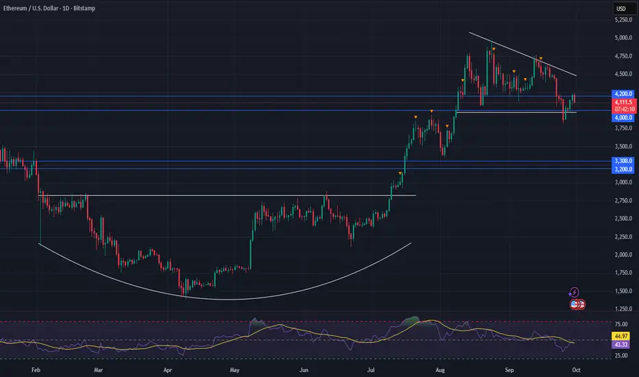 Ethereum is retesting a major support zone between 4000–4200. This area has acted as a springboard before, but if it breaks decisively, it could flip to resistance, introducing more headwinds for bullish momentum.