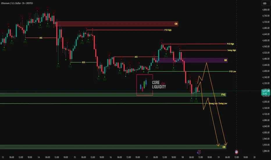 From there, rejection into downside continuation targeting FVG + liquidity below 4200.
